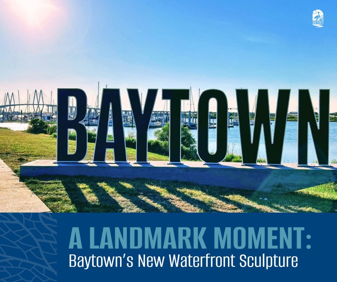Baytown’s newest landmark is impossible to miss and impossible not to photograph. The bold “BAYTOWN” sculpture, standing seven feet tall and overlooking the Fred Hartman Bridge and the bay, now welcomes visitors and locals alike to Bayland Island near the Hyatt Regency and Bayland Marina.