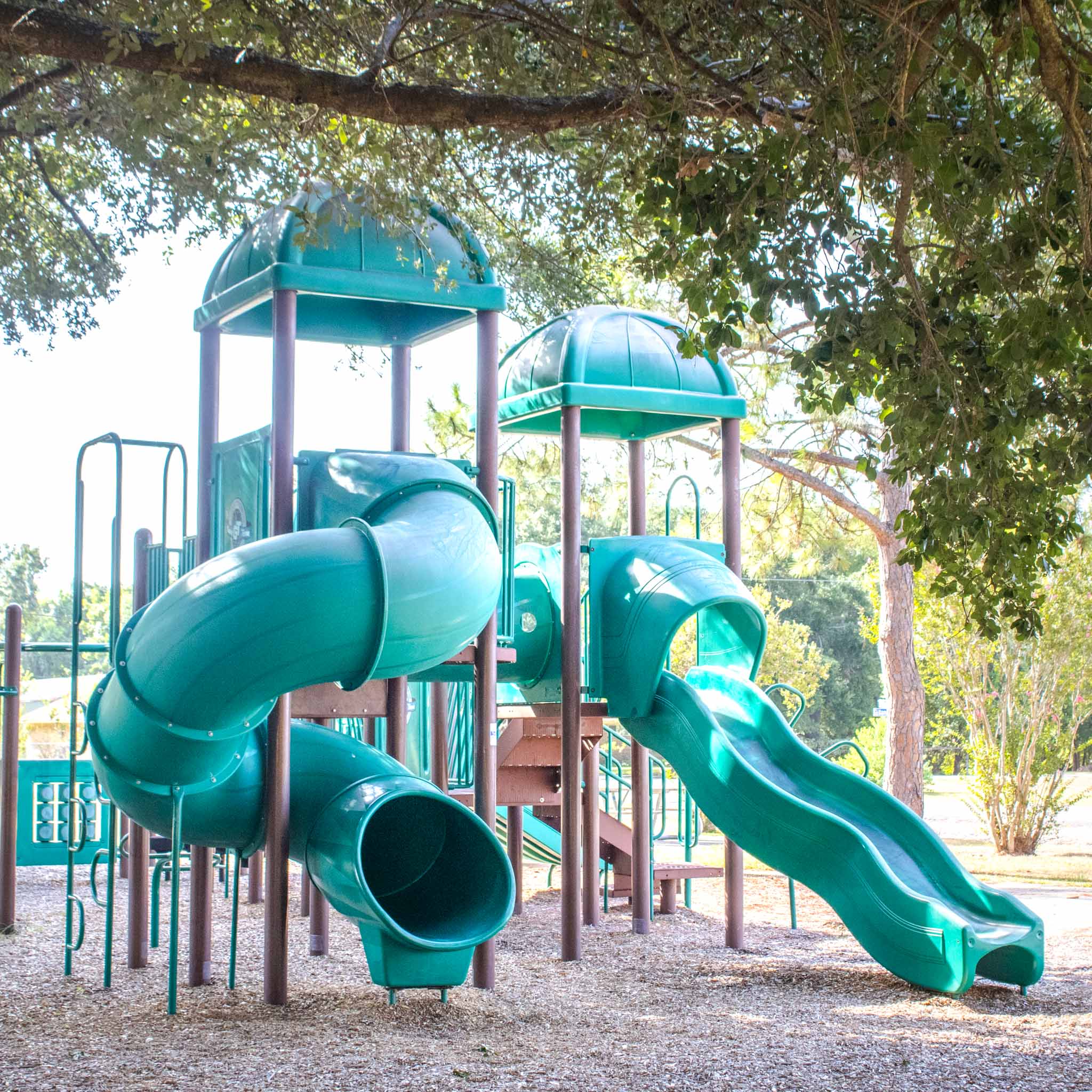 Murdoch Park is at the corner of Danubina St. and E Hunnicutt Ave. The playground has multiple slides, swings, and climbing structures. There is a picnic table and a bench near the playground for supervising kids on the playground. There is also a basketball hoop for practicing shots or a casual game with friends.